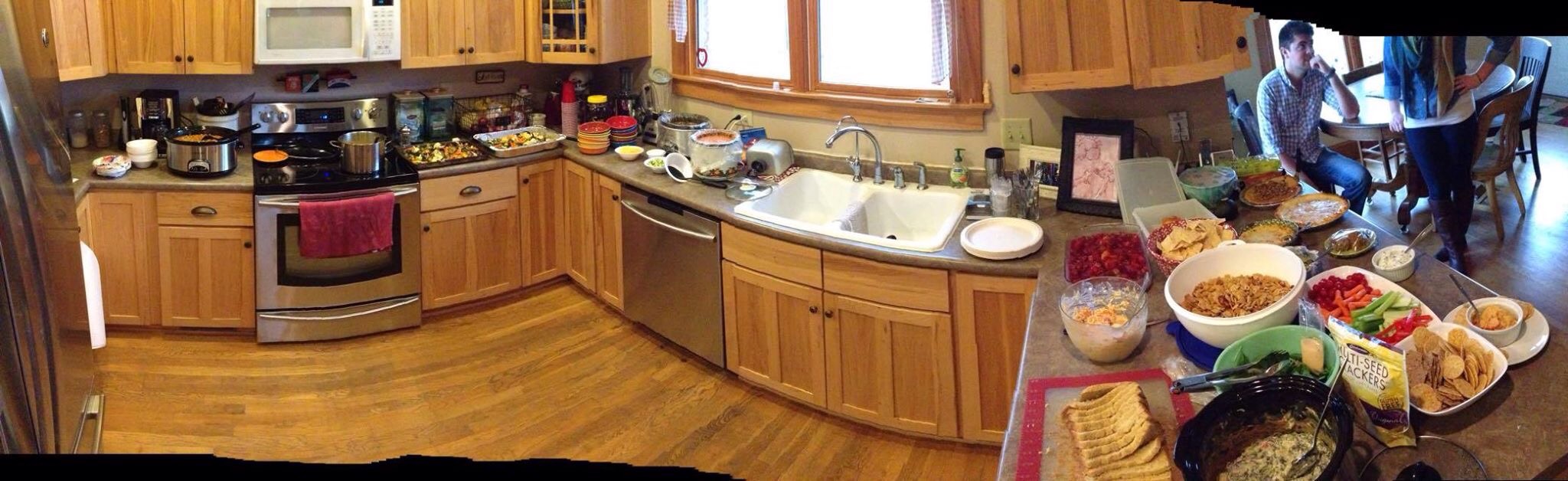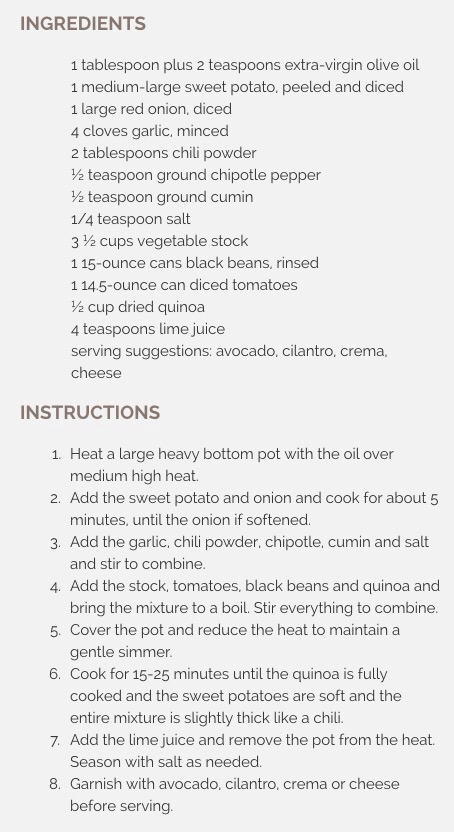 My family’s relatively new tradition is to have a vegetarian, gluten, soy, corn, peanut free, low cholesterol menu. This will be the second year for this due to dietary restrictions of a few family members. What we have at this celebration is veggies and dip, soups, salads and desserts. I know it sounds like it would be difficult to fulfill these parameters but it’s easier than you think! I make black bean sweet potato chili (Recipe courtesy of Whatsgabycooking.com) and apple crisp.