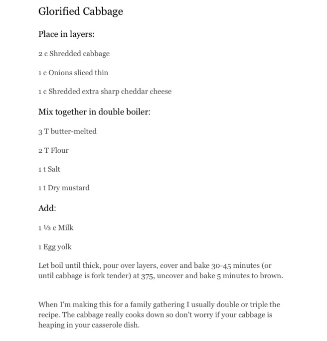 This evening I have been getting a few things ready for Thanksgiving. Since I have to work all day, the day before Thanksgiving, the more I can get done beforehand the better! We actually have two celebrations, one on the day for my husbands family which we are hosting. The other is on Sunday with my family. Each celebration has their own traditions in regards to the menu. The menu for my husbands family is traditional. I have in dish they request every year which is, Glorified Cabbage. It’s like a cheesy scalloped cabbage casserole. I was given the recipe years ago by a friends mother (thank you Sharon!) Here it is, I promise I’ll post a pic after I make it Thursday!