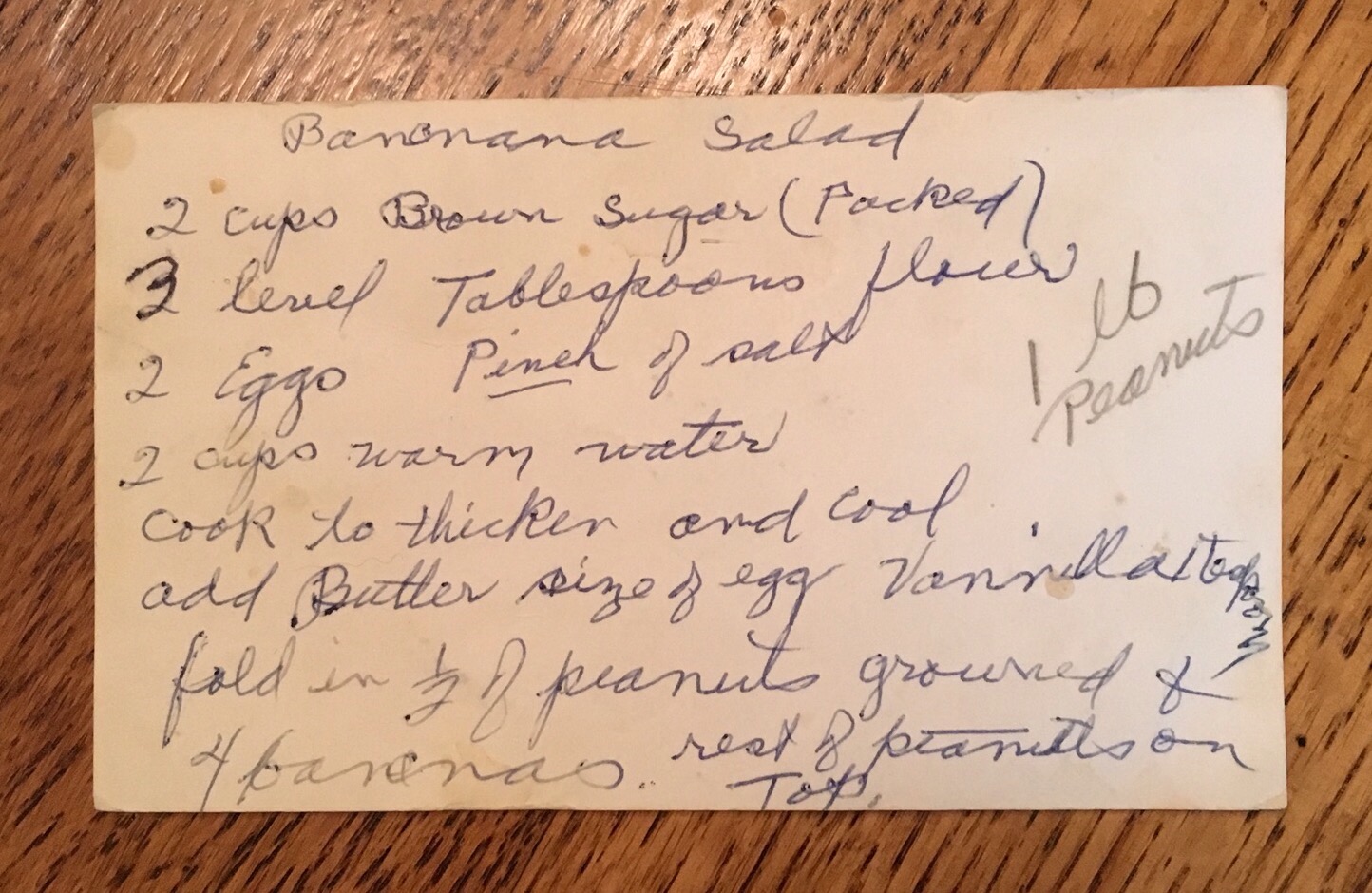 One thing I always make at the holiday time is banana salad, it was my grandmothers recipe. Although, I have written it down on my own recipe card I still pull out my grandmothers recipe card. It’s in her handwriting and has many stains on it but I feel like when I use it she is right there in the kitchen with me.😍 It’s not really a salad but more of a caramel pudding with bananas and peanuts. So if your a peanut butter and banana lover you should try it!