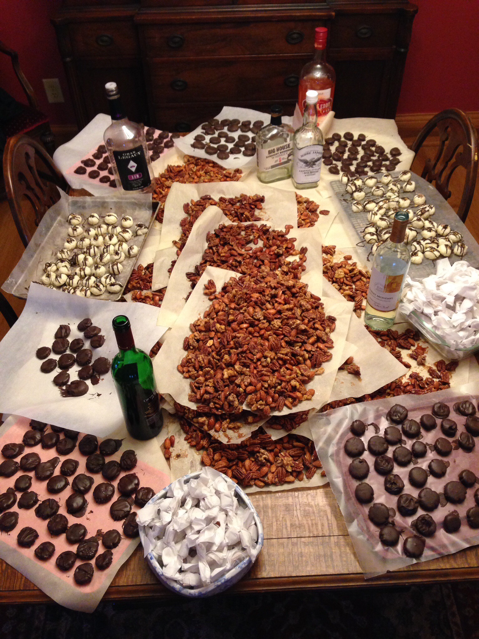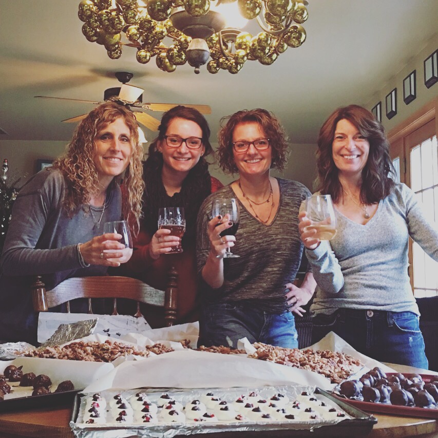 We have been doing it long enough now that we kind of have it down to a science! Although over the years some of the candy we make has changed out of necessity due to dietary restrictions we still manage to make A LOT! My Sister-in-law is in charge of the candied nuts, she has done it enough that she can tell by the way they look if they are done or not! I make the carmels and help mix up whatever truffle(s) we are making. My cousin does a lot of the ‘balling’ of the truffle filling. My daughter helps out with whatever is needed. Then once everything has been balled up and chilled we all begin the chocolate dipping. It’s not really that easy to make them pretty but after a few we usually get in a groove and do a pretty good job if I do say so myself! This year we made 200 bourbon balls, 60 peppermint patties, 100 salted caramels, 3 pounds of dark chocolate bark and 10 pounds of candied nuts. It takes all day and we only stop when the balls are chilling to have lunch. Then after its all done we celebrate with a glass of wine before we start counting up everything and dividing them up between us so we can box them up for gifts.
