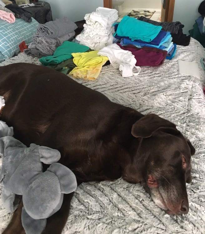 Of course the whole bedroom was a wreck during my purging process. I also had to shoo off DH several times, I didn’t need his 2 cents on all my stuff…ha! I did have moral support from my girl, Krimley, and her elephant…