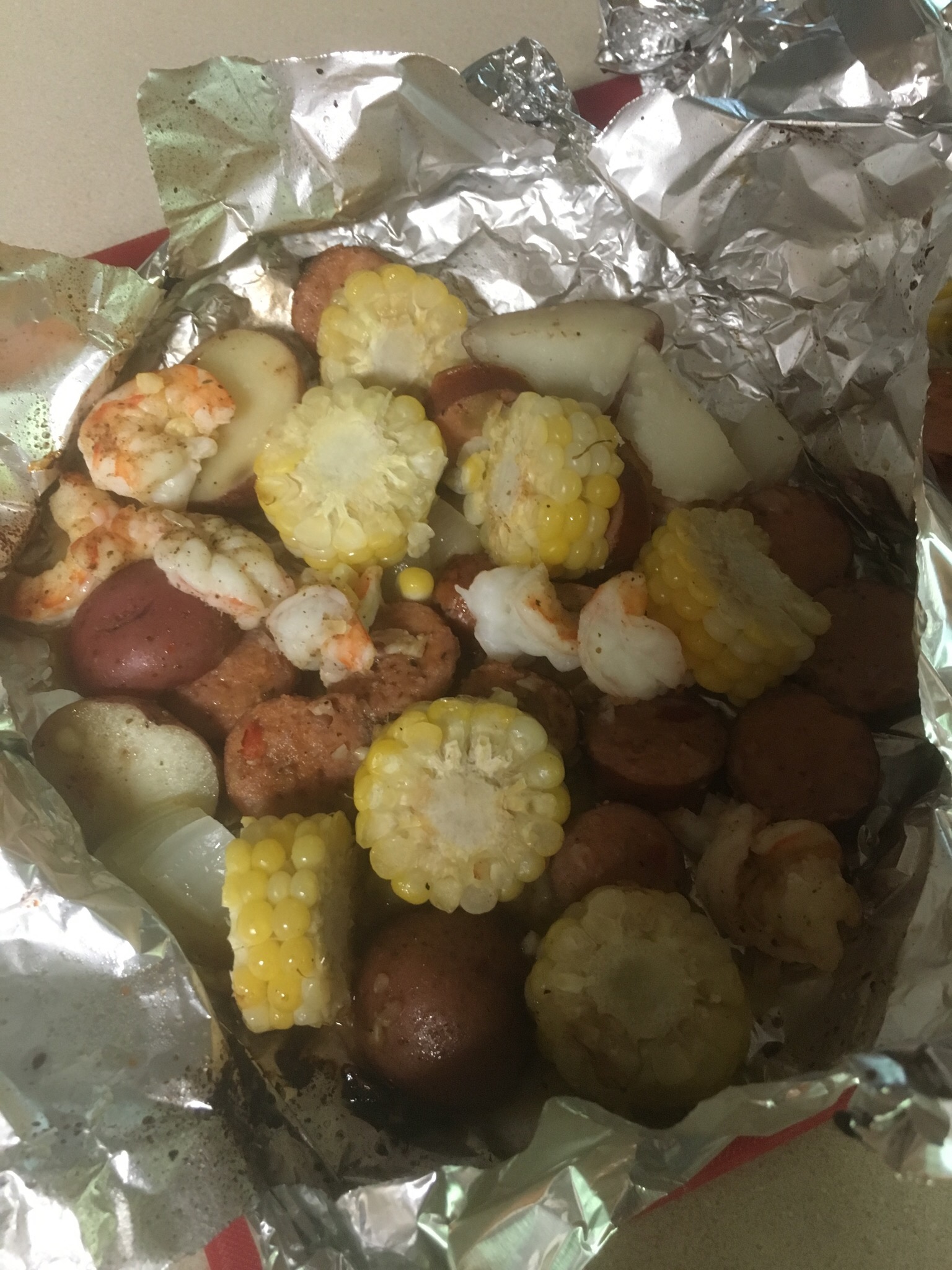 Slice the sausage in bite size pieces, cube the potatoes, cut the corn into 1-2″ pieces