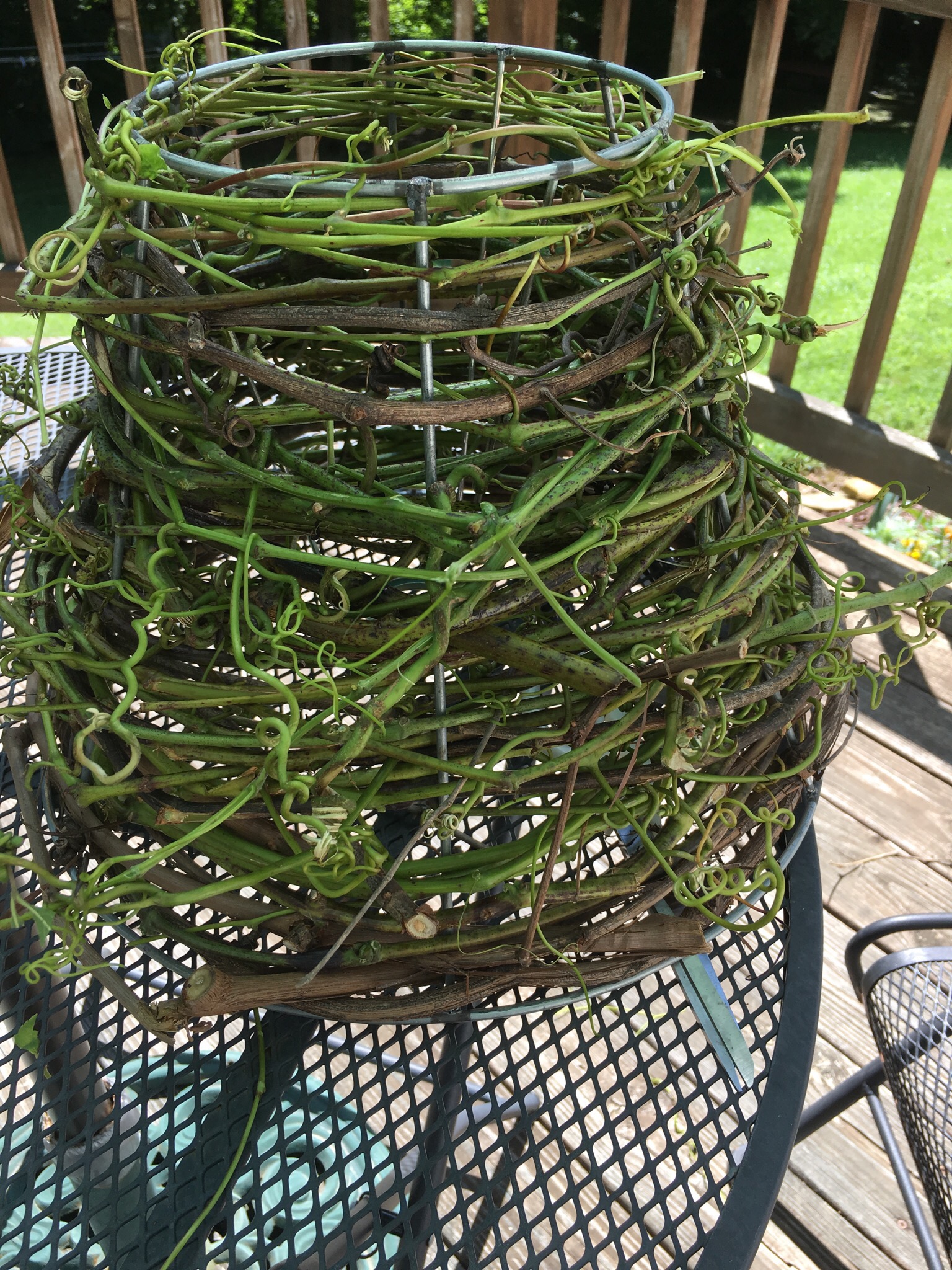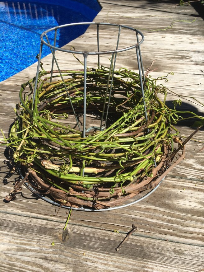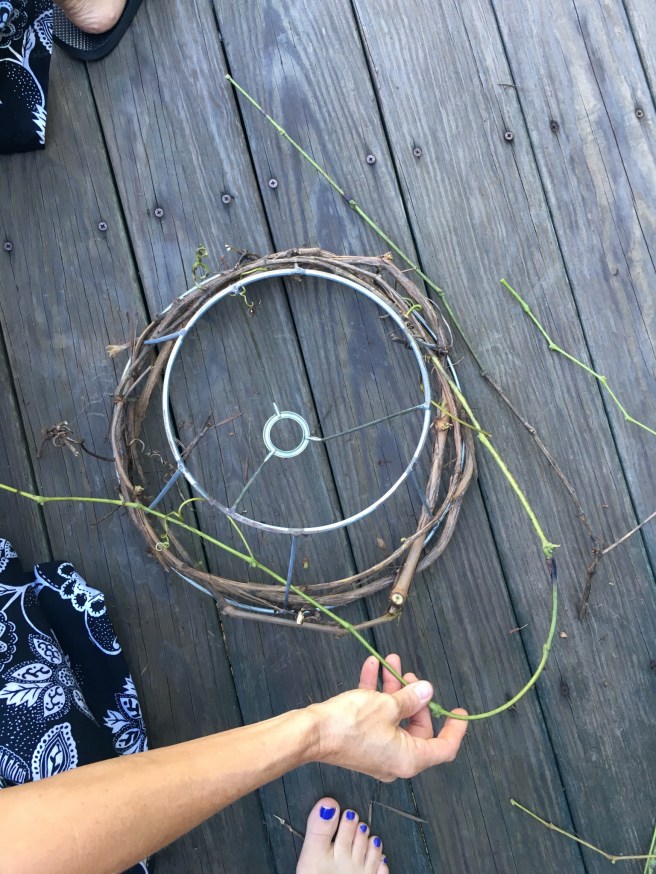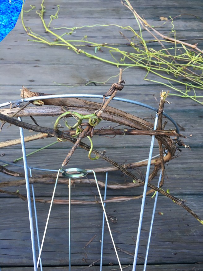 Once the old covering is gone now it’s time to weave the grapevine around the shade frame. Make sure you alternate front and behind the vertical supports as you go around. When you come to the end of a vine just tuck the end of the new one and continue weaving.