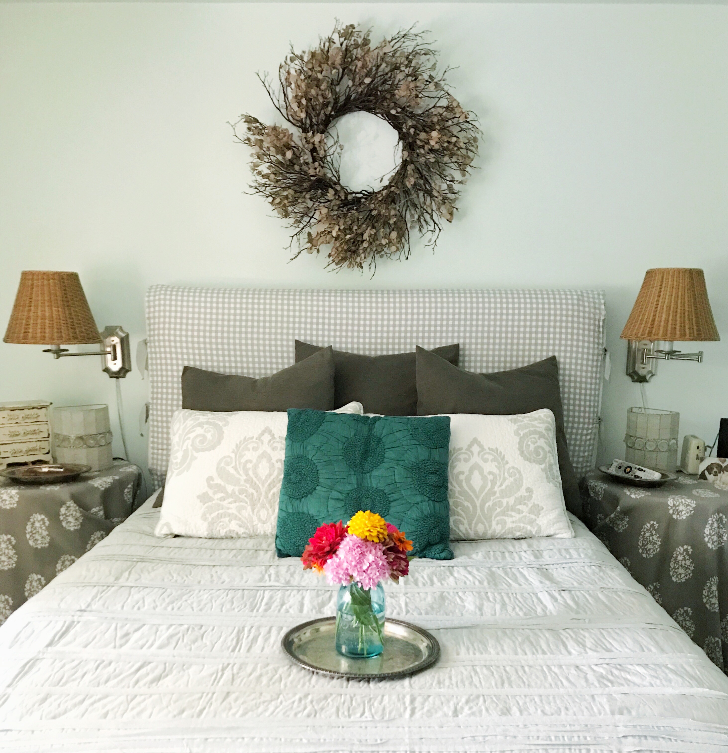 So I snapped it up and thought I would sew a slipcover for it from the flat sheet. But I wanted to try it out first. I draped the sheet over my head board and put on a new gray quilt I had been saving for fall.