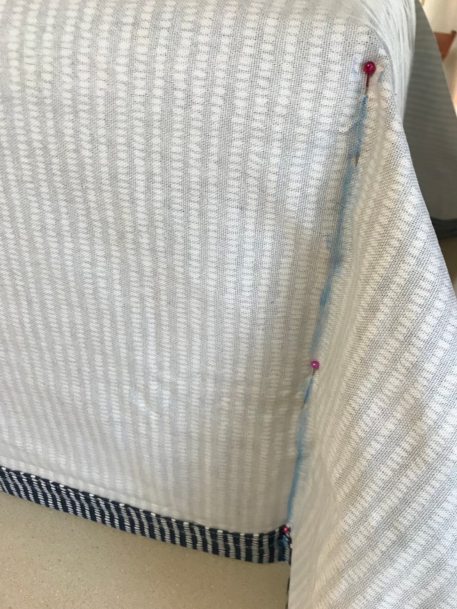 The first step is to lay the panel out wrong side out to see if you need to hem any of the sides. I had to hem one of the short and one of long sides so the hem would go to the floor. (I did it this way because the ottomans are slightly different and this way they look like the matchπ)