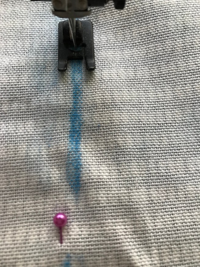 Now it’s time to sew the corner seams. Following the pins and the chalk line.